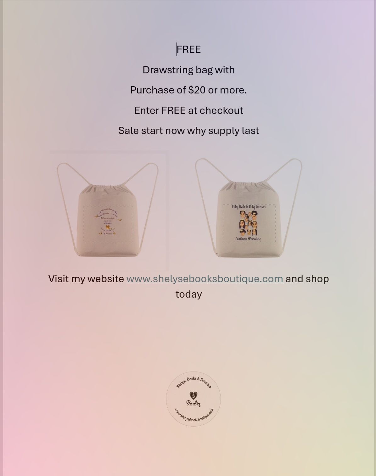 FREE Drawstring bag with your purchase of $20 or more. Enter FREE at checkout. Special will continue until all bags are gone. So take advantage of this special